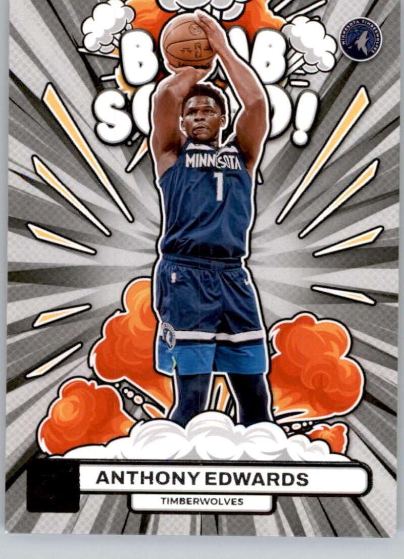 The 2023-24 Donruss Bomb Squad Basketball Card features Anthony Edwards of the Minnesota Timberwolves.