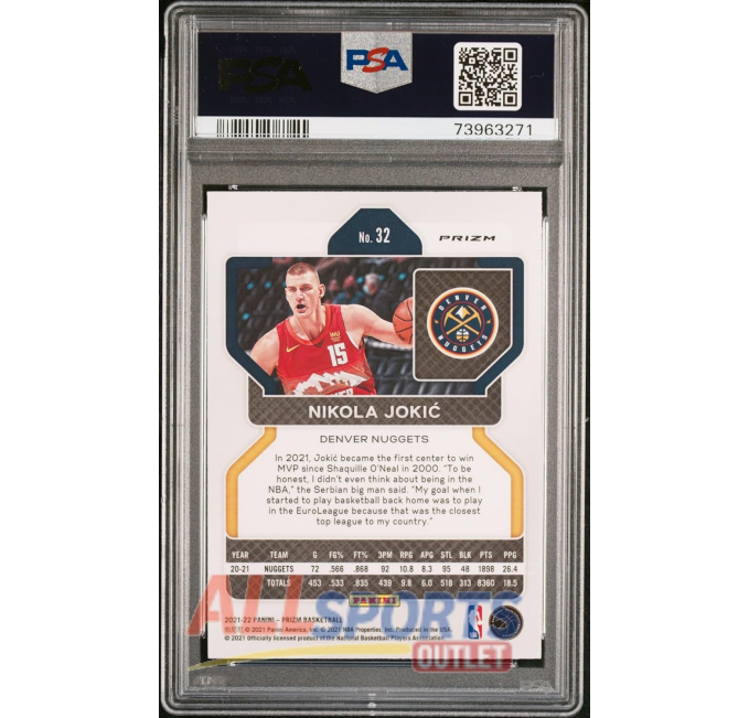 The 2021 Panini Prizm Purple Wave Nikola Jokic Basketball Card features a stunning design and vibrant colors. A must-have for collectors, it showcases the reigning MVP in a rare parallel style. Perfect for adding value to any collection or as an investment piece for NBA fans. High-quality print with a unique shimmer effect.