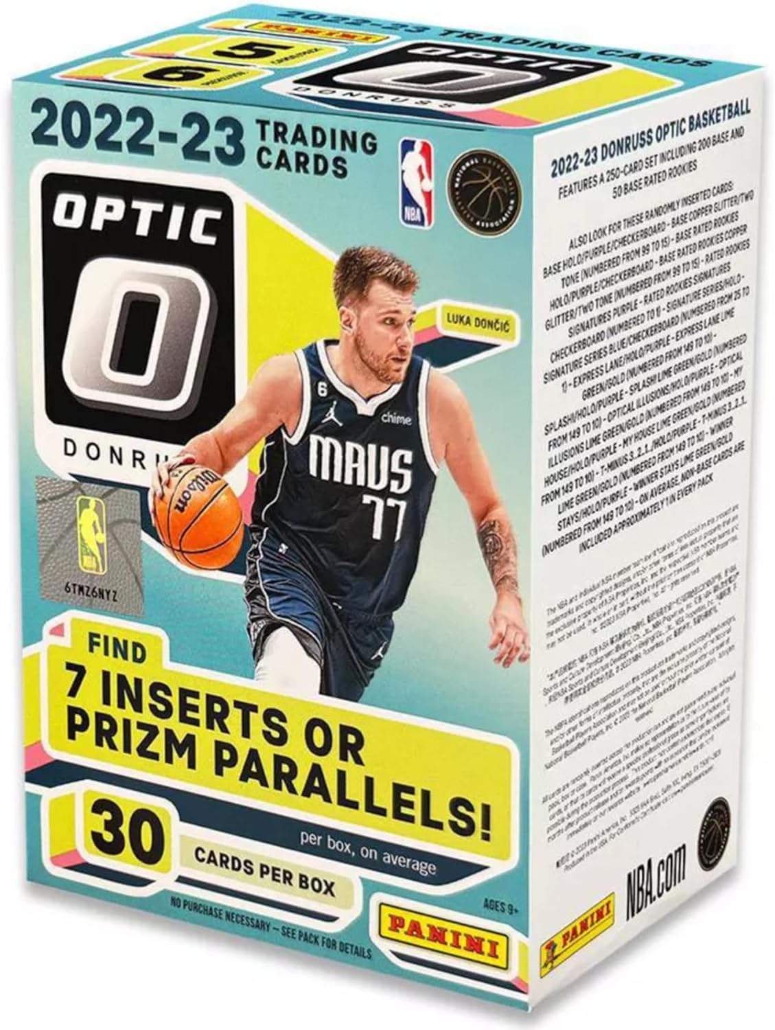 The 2022-2023 Panini Donruss Optic Basketball Blaster Box contains 6 packs of premium cards.