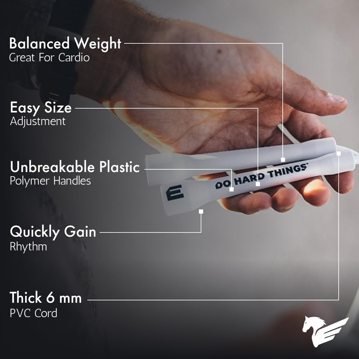 The Elite Jumps 6mm PVC Jump Rope is designed for fitness and boxing. It features unbreakable handles and ultra-durable, non-kinking PVC for long-lasting use. Ideal for both indoor and outdoor workouts, this adjustable rope is perfect for men and women seeking a high-performance skipping rope.