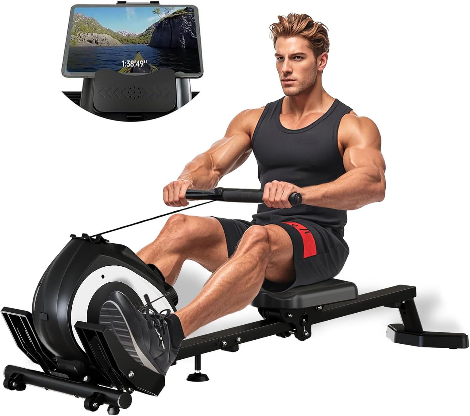 The UTRYUP Magnetic Rowing Machine features a foldable design, making it perfect for home use. It boasts a quiet flywheel system, Bluetooth compatibility, and an extended slide rail for smooth rowing. With a 350 lb weight capacity and a comfortable seat cushion, it delivers a premium fitness experience. Ideal for all levels.