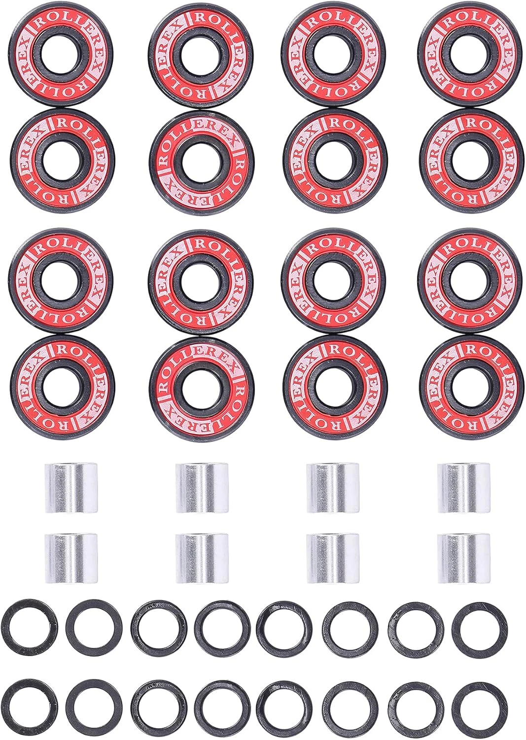 Includes 16 bearings, 16 washers, and 8 spacers for enhanced ride quality.