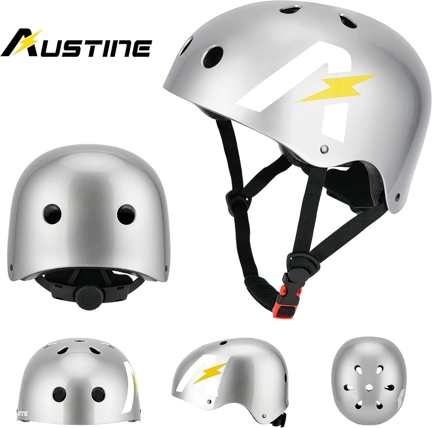 The USTINE Skateboard Helmet and Protective Gear Set is designed for kids and adults. Includes knee, elbow, and wrist pads for optimal protection. Ideal for skateboarding, cycling, rollerblading, and more. Provides comfort, safety, and durability for various outdoor activities.