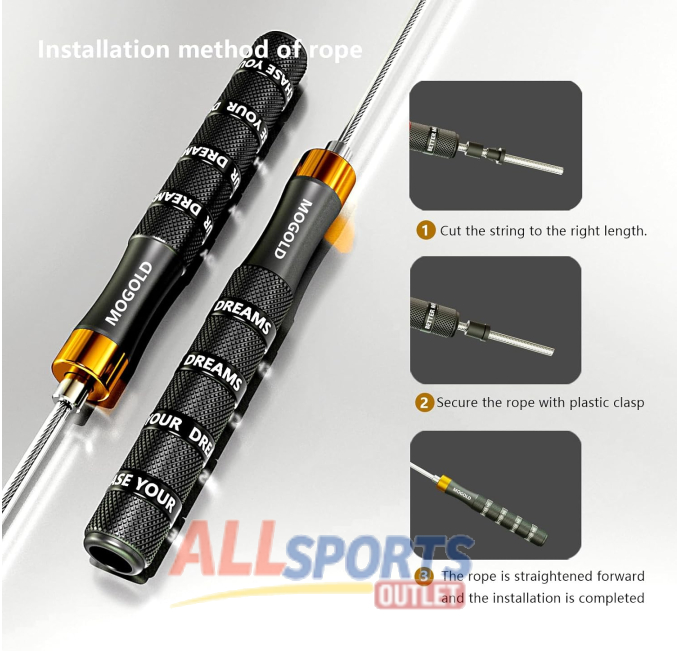 The MOGOLD Speed Jump Rope is designed for fitness enthusiasts. With adjustable length, alloy and silicone handles, this rope is perfect for workouts, boxing, and home gym use. Ideal for both men and women, it ensures a comfortable grip and durability during exercise.