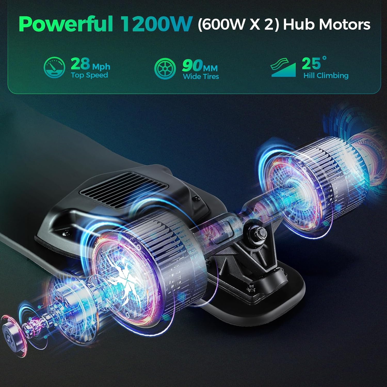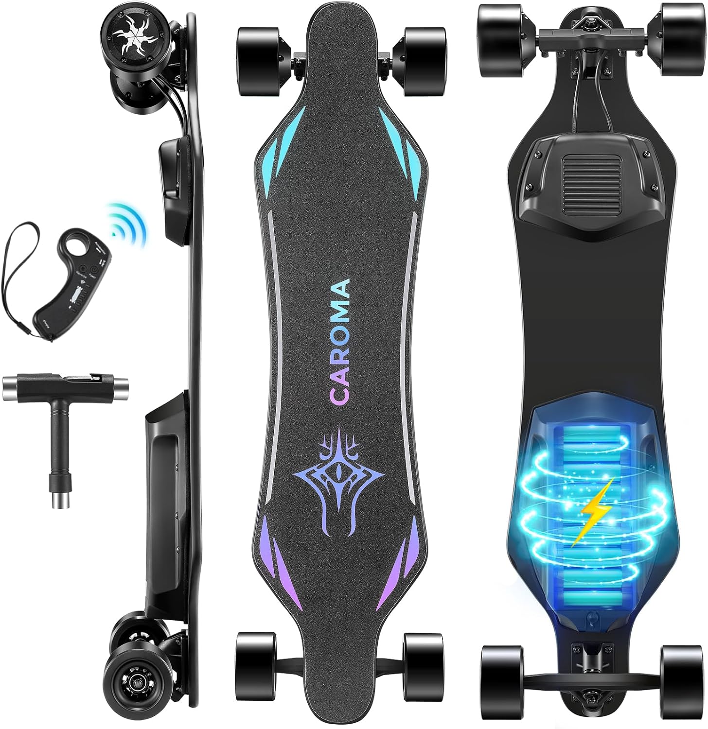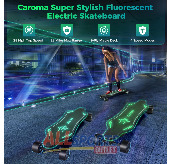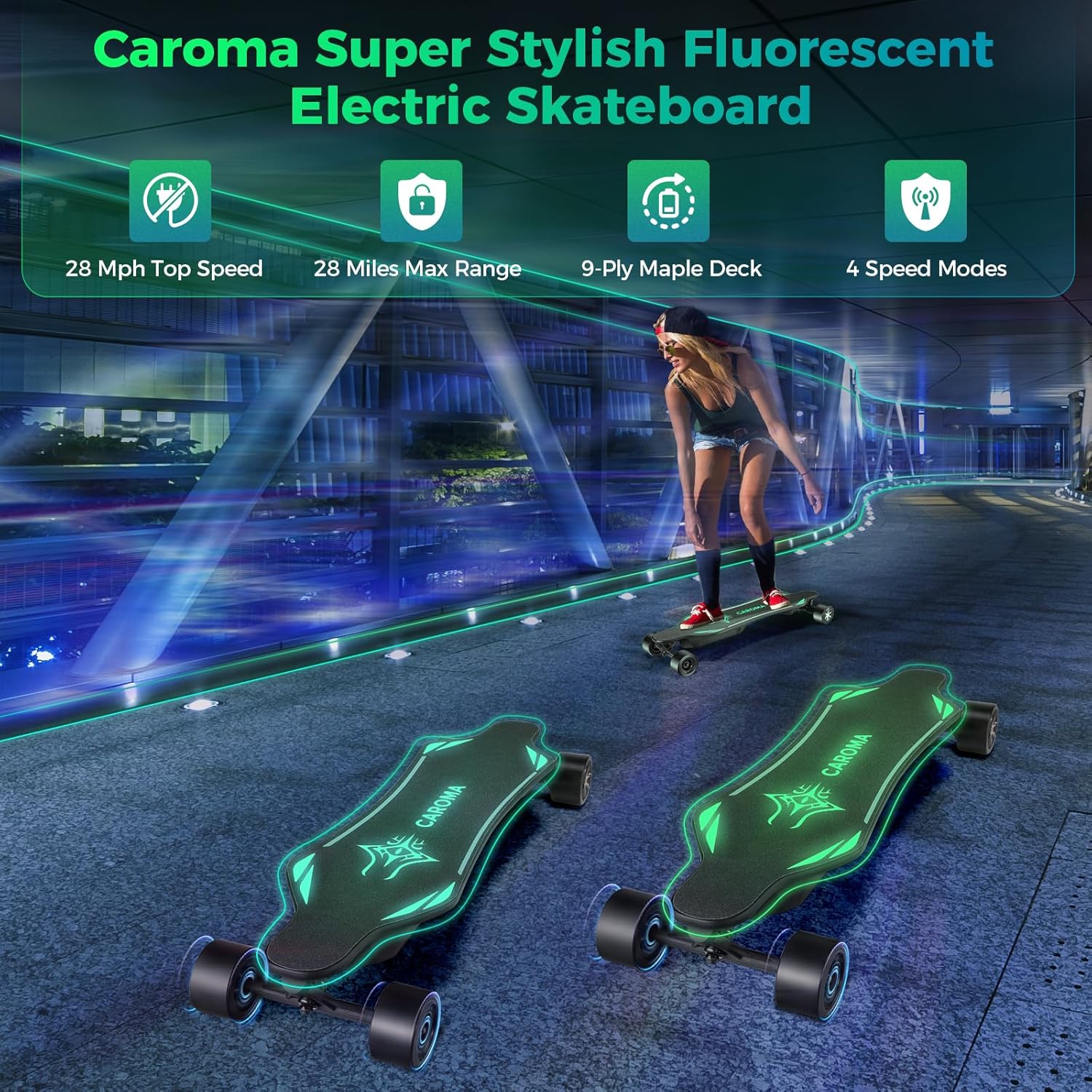 The Caroma Electric Skateboard offers a top speed of 28MPH with a 16-mile range, making it perfect for both teens and adults. Features a powerful 1200W brushless motor and four speed settings for optimal control. Designed for beginners and experienced riders, it includes a remote for easy adjustments and glow-in-the-dark features for added safety.
