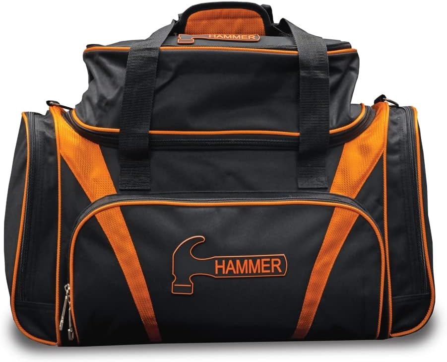 The Hammer Bowling 2 Ball Deluxe Tote offers compact and convenient storage for up to two bowling balls. Features a durable black and orange design with a comfortable handle. Ideal for bowlers seeking a reliable and stylish tote bag for easy transport.