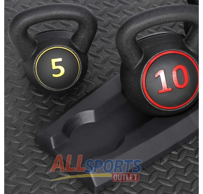 Includes 5 lb, 10 lb, and 15 lb kettlebells for varied exercises.