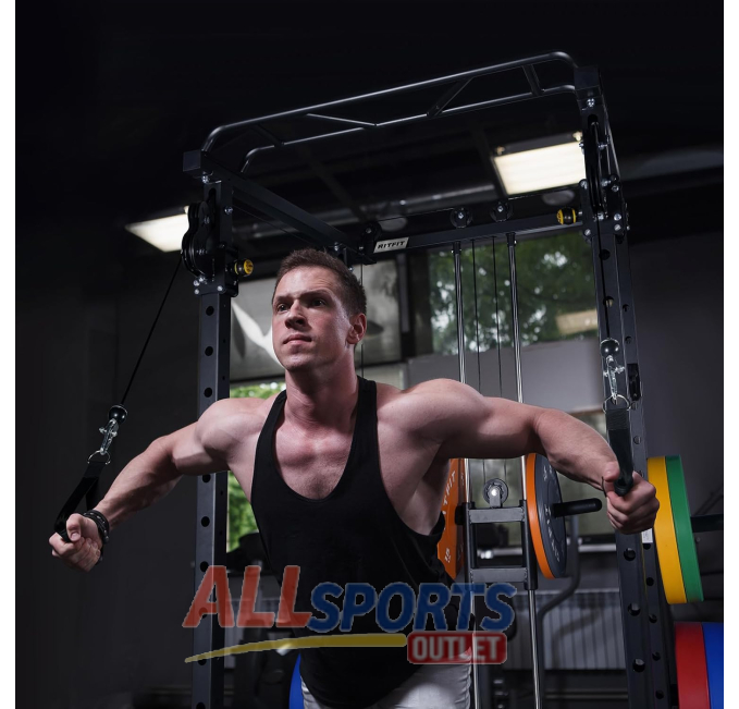 The RitFit Smith Machine Power Rack is a comprehensive home gym solution designed for strength training and bodybuilding. Featuring a LAT-Pull Down system, landmine attachment, and barbell bar, this versatile power rack provides everything you need for a full-body workout. Its adjustable features ensure a customizable workout experience, while plate storage pegs help keep your space organized. Built with durability in mind, it supports heavy lifting and is perfect for those serious about their fitness journey. Ideal for home gyms and garages.