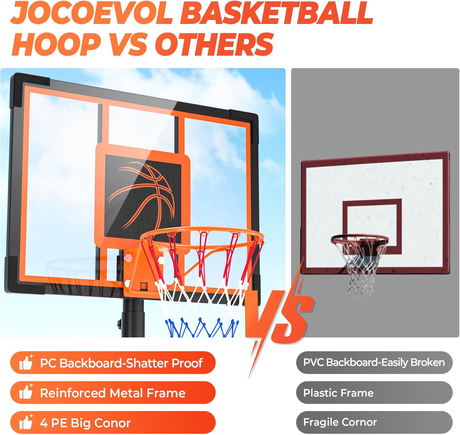 Jocoevol portable basketball hoop features adjustable height for versatile play.