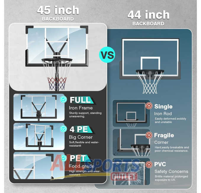 Durable 45-inch shatterproof backboard designed for outdoor play.