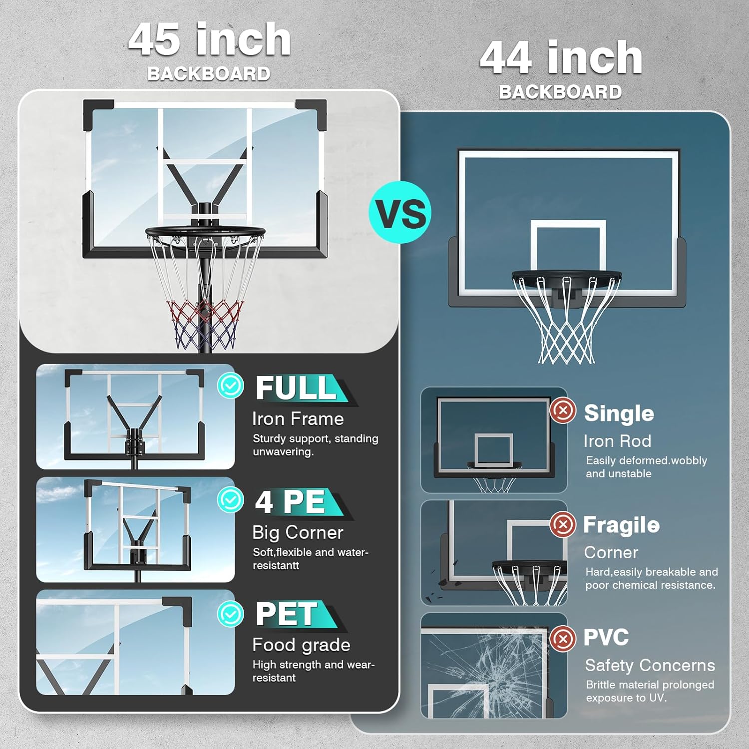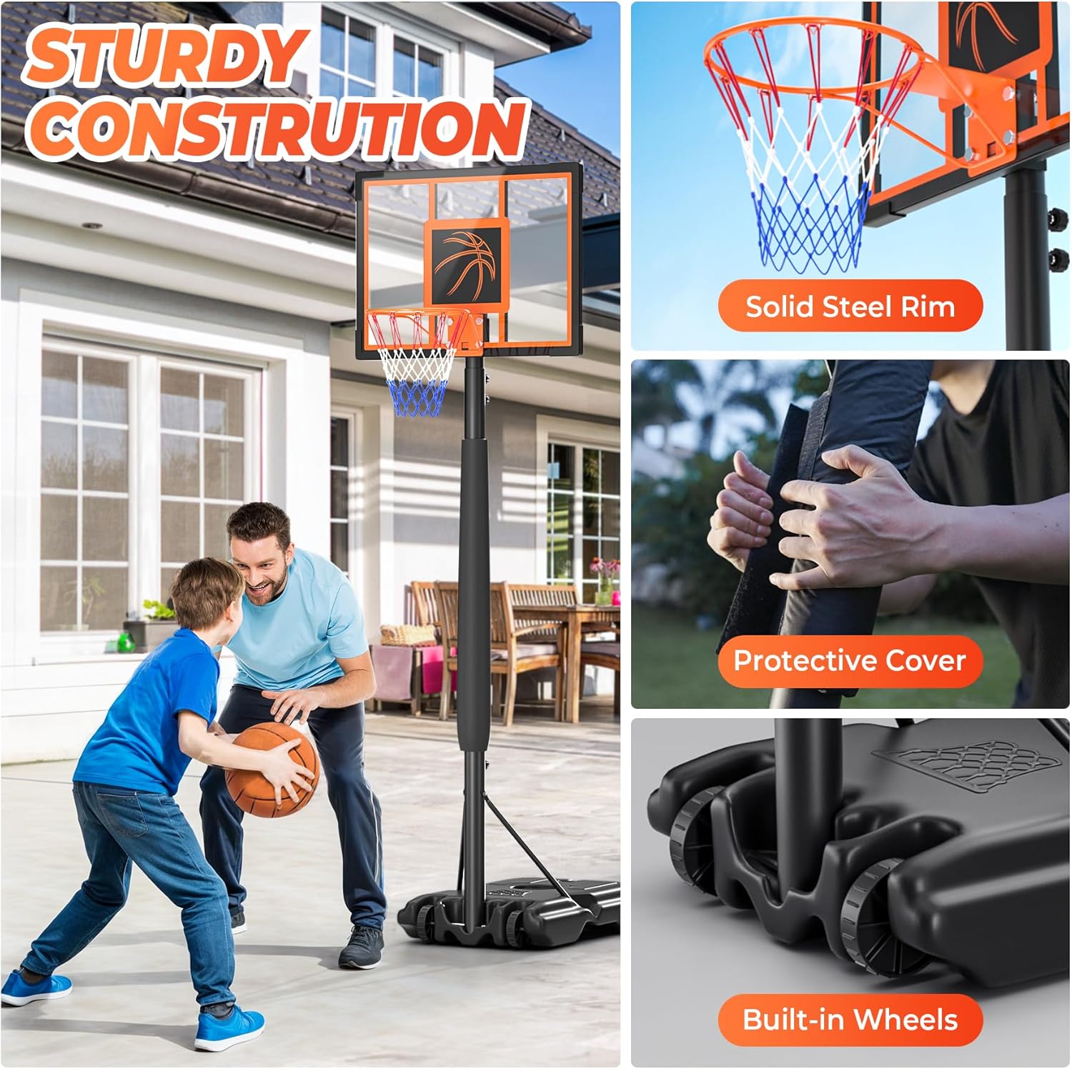 The Yohood portable basketball hoop features a 10ft adjustable height, ideal for players of all ages. Perfect for backyard, driveway, or court use, it’s equipped with a durable 44-inch PC backboard and easy-to-move wheels. Designed for stability and convenience, it offers a smooth setup for any outdoor game. Ideal for outdoor enthusiasts seeking a reliable, adjustable hoop system.