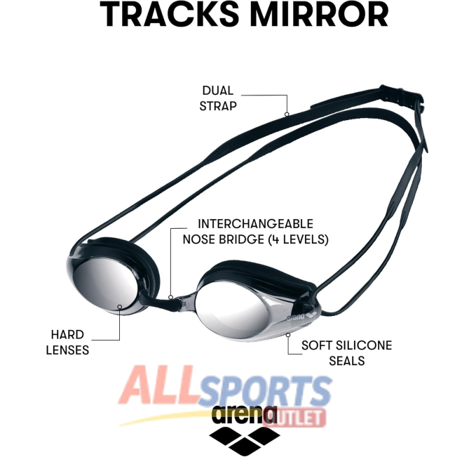 Arena Tracks racing swim goggles are FINA-approved and designed for competitive swimmers. Featuring anti-fog coated mirror lenses for clear vision and reduced glare. Adjustable straps provide a secure, comfortable fit for both men and women. Ideal for professional-level performance.