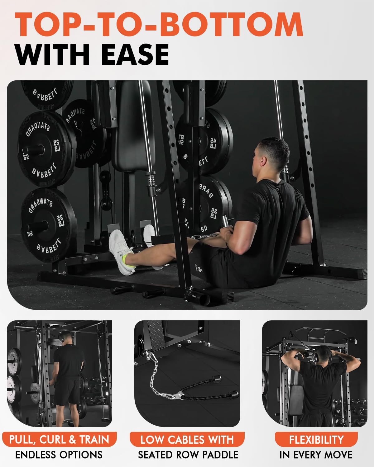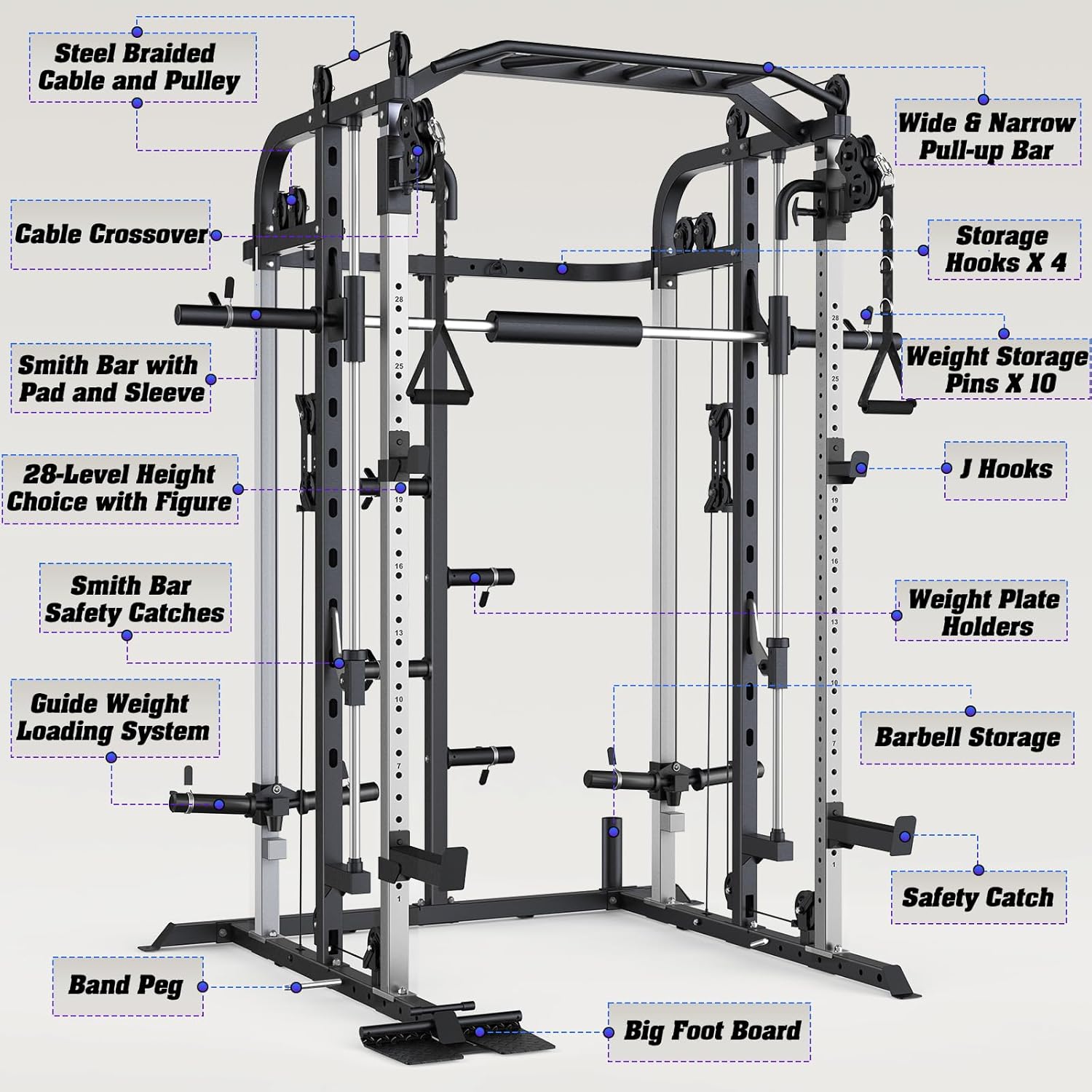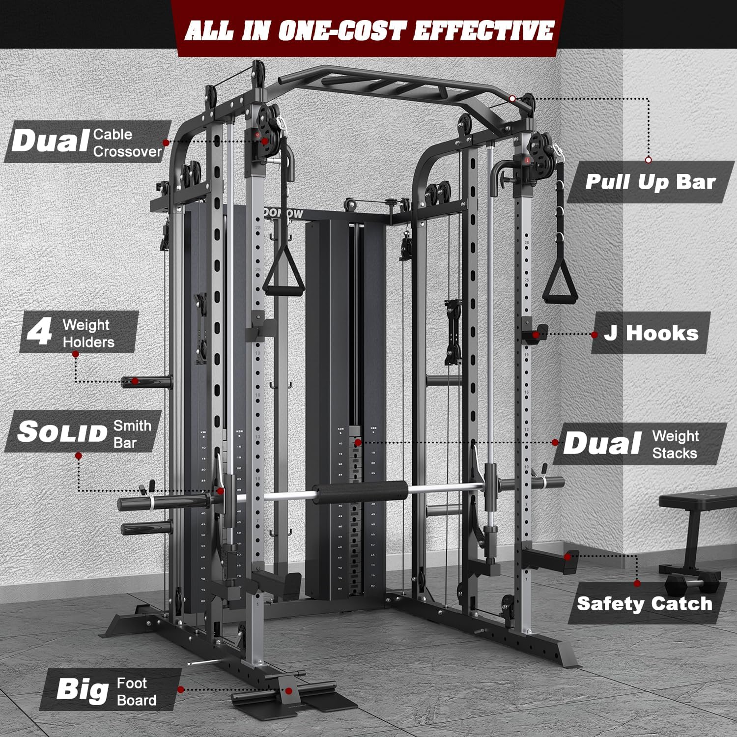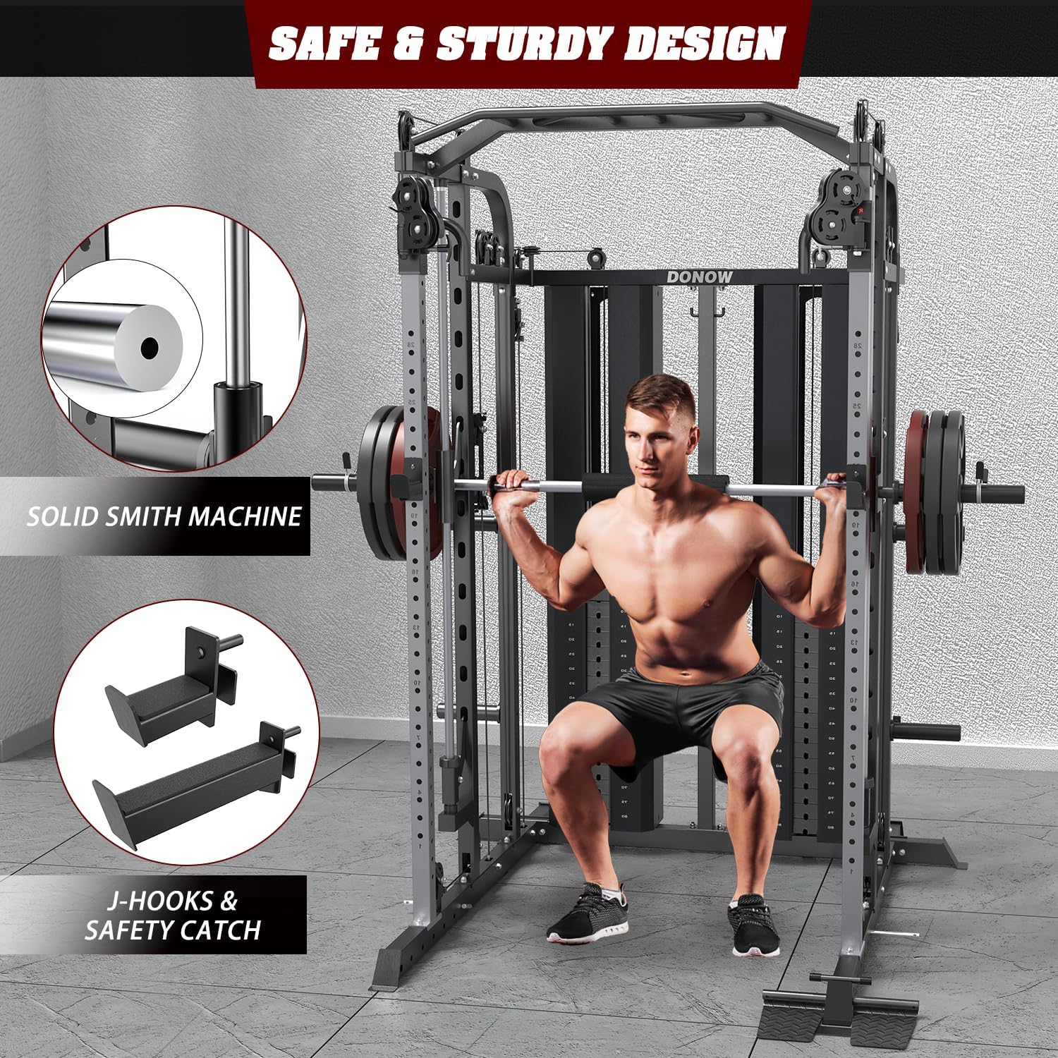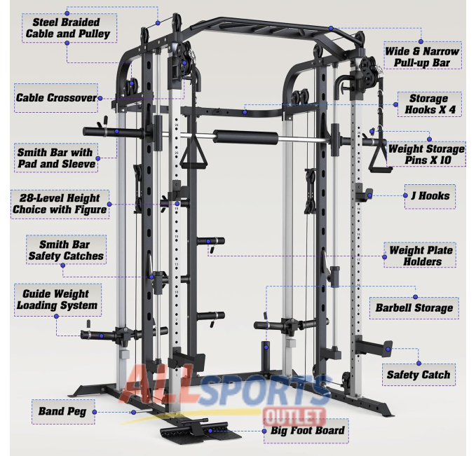 The DONOW Smith Machine Squat Rack with Cable Crossover Machine is a complete home gym system. It features a 160kg weight stack, dual cable crossover, and LAT pull-down for a full-body workout. With a sturdy power cage and squat rack, this all-in-one gym system is perfect for strength training at home. Built for durability and versatility, it offers a wide range of exercises to target all muscle groups.
