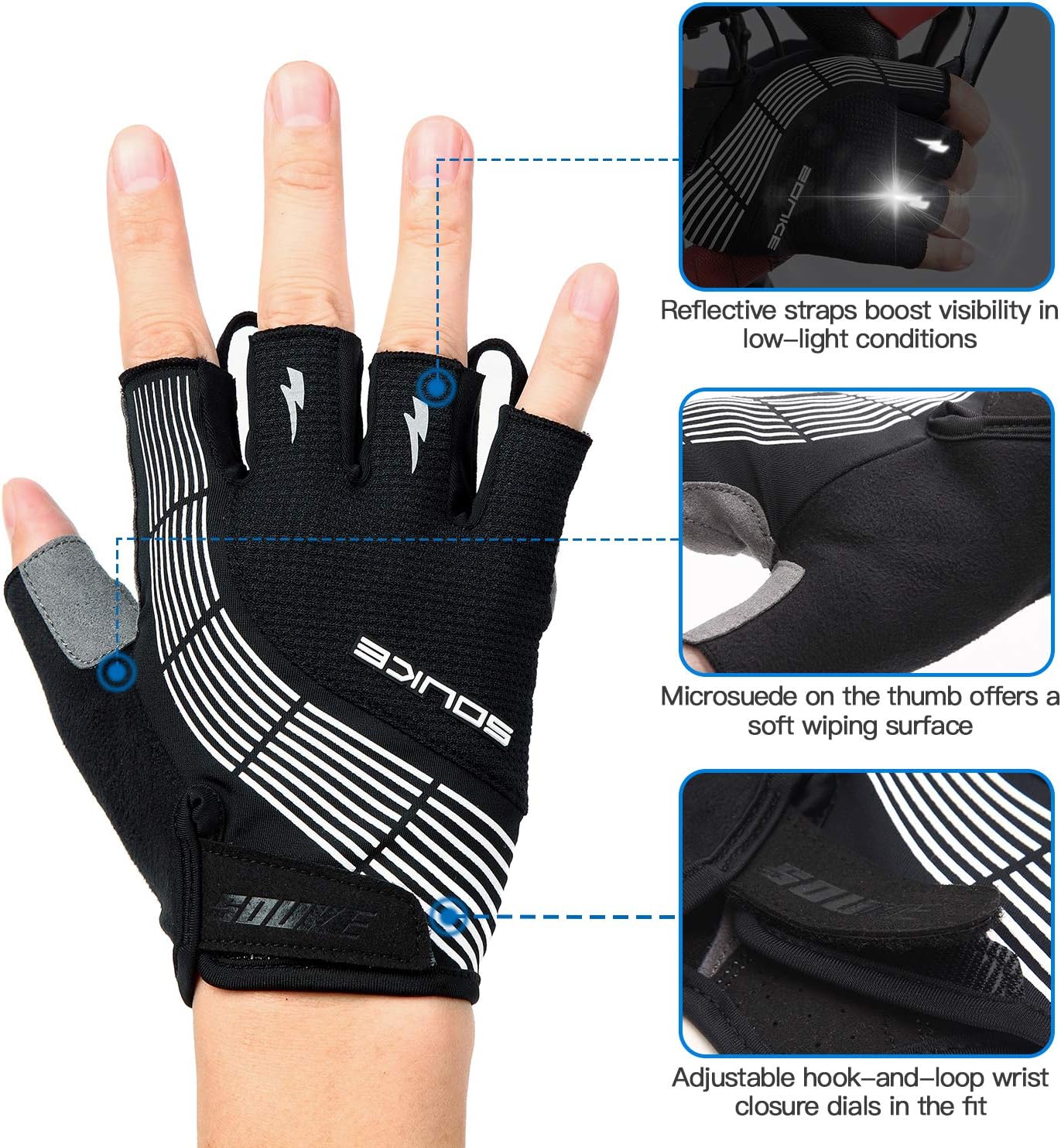 The Souke Sports Cycling Gloves are designed for comfort and performance. Featuring padded half fingers, shock-absorbing material, and breathable fabric, these gloves provide a secure anti-slip fit. Ideal for MTB and road biking, they offer excellent protection and durability for both men and women. Perfect for long rides and tough terrains.