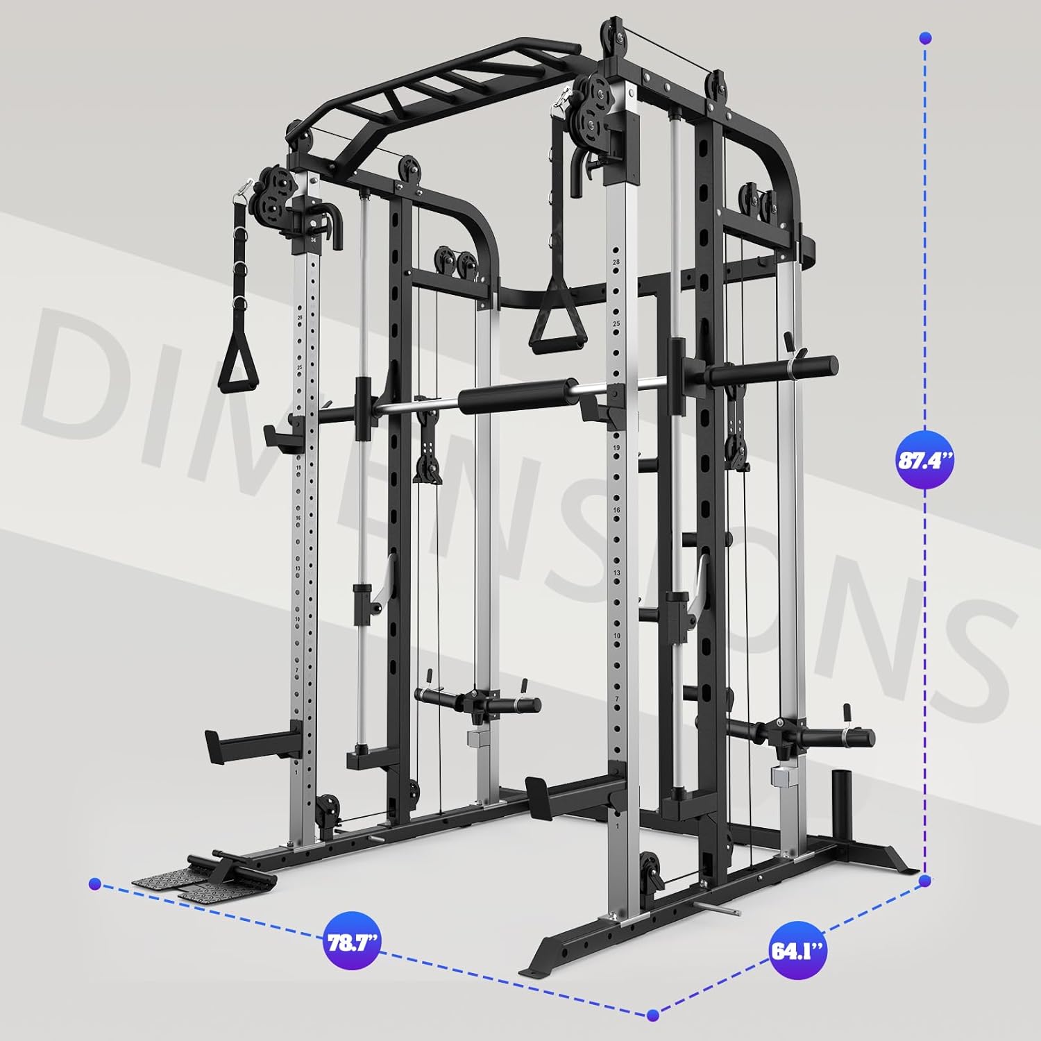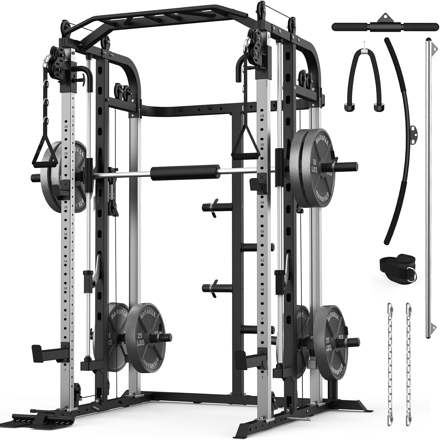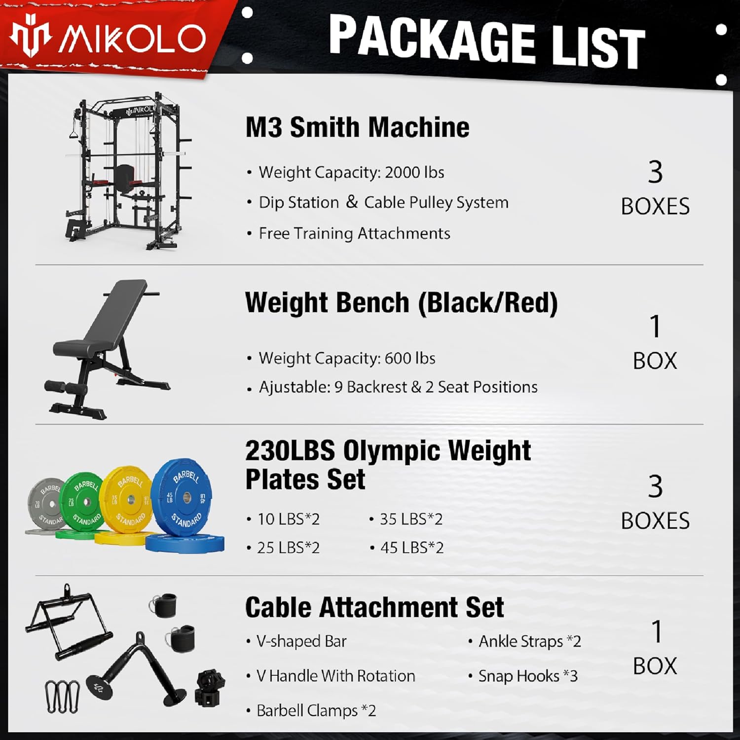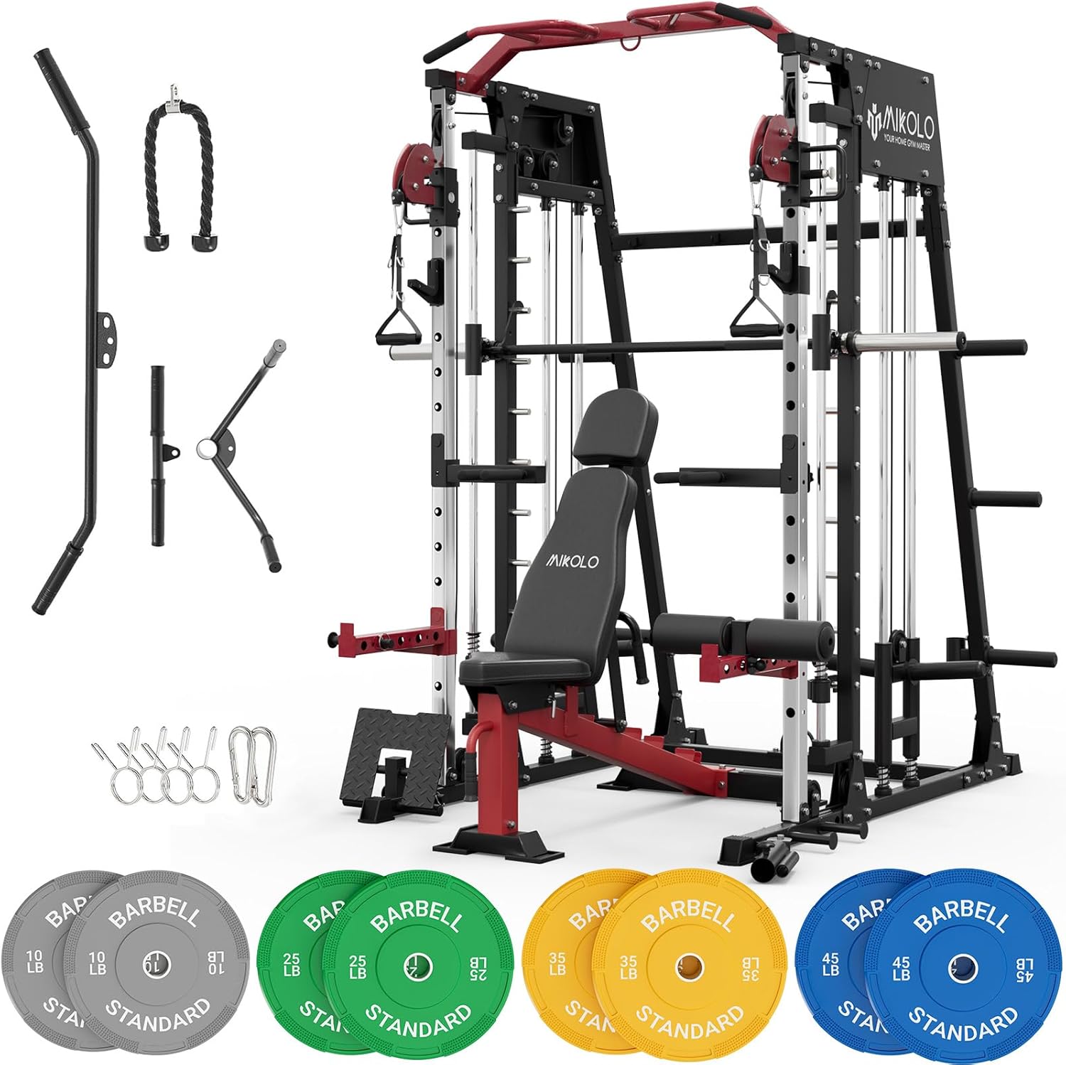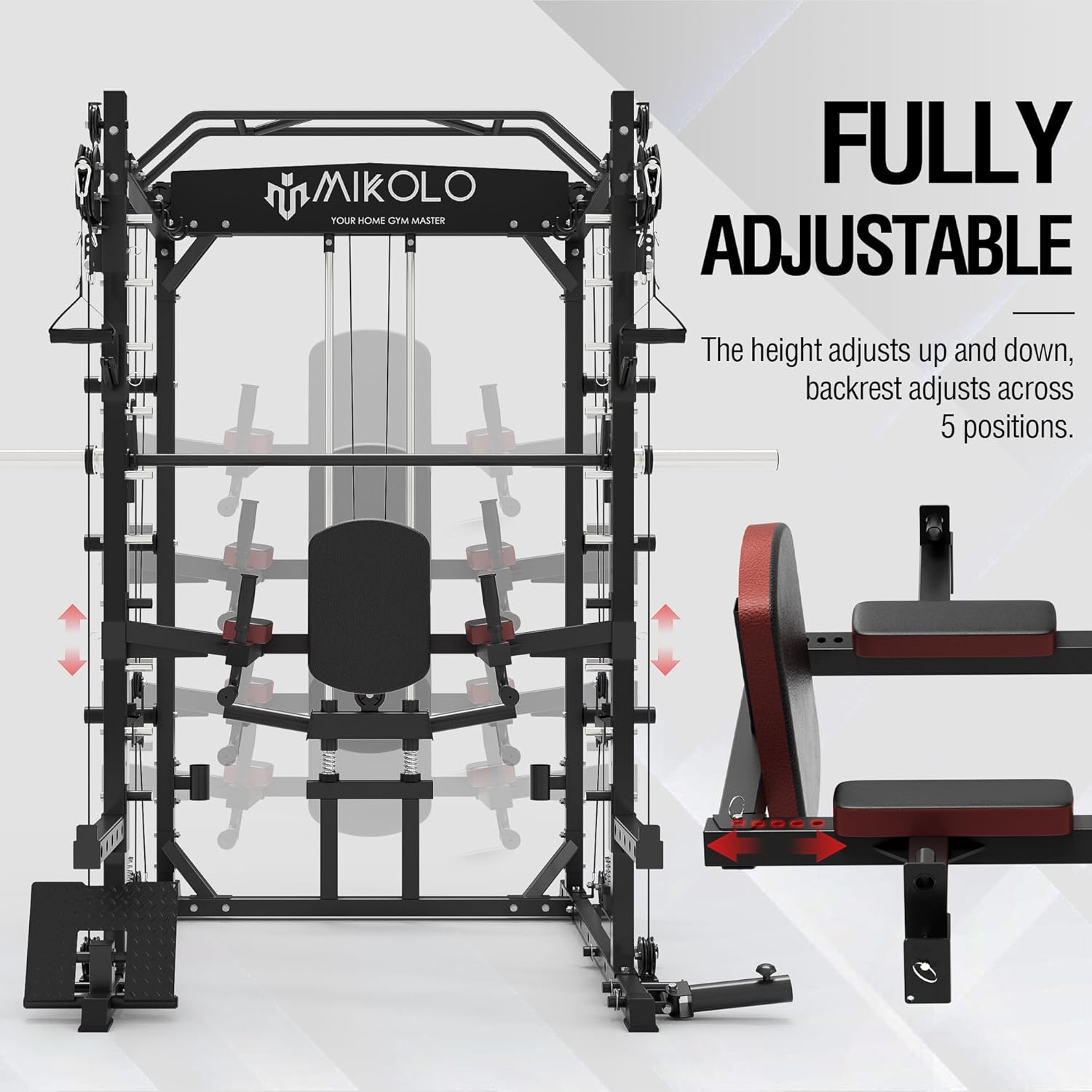 The Mikolo Smith Machine offers a versatile and complete home gym experience with a 2000LB capacity power cage. It includes a cable crossover machine and LAT pull-down system for full-body strength training. The 230LBS weight plates set and adjustable bench allow for a variety of workouts. Perfect for home gym setups focused on improving strength and fitness with durable materials for long-lasting performance.