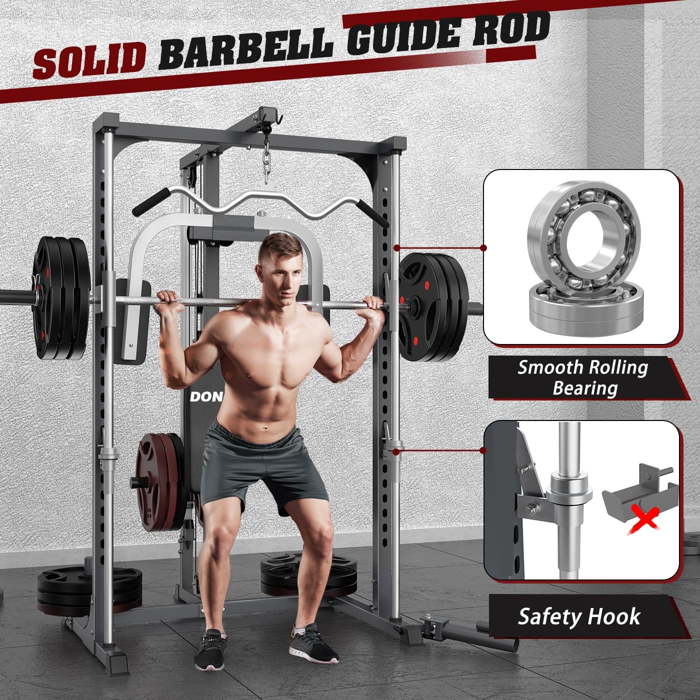 The Smith Machine Power Rack Squat Rack Bench is a versatile home gym system designed for strength training. Includes a Smith bar, squat rack, and bench station for various exercises. Features a LAT pull-down system for upper body workouts. Built to support intense training, perfect for building muscle and increasing strength. Ideal for home gym setups.