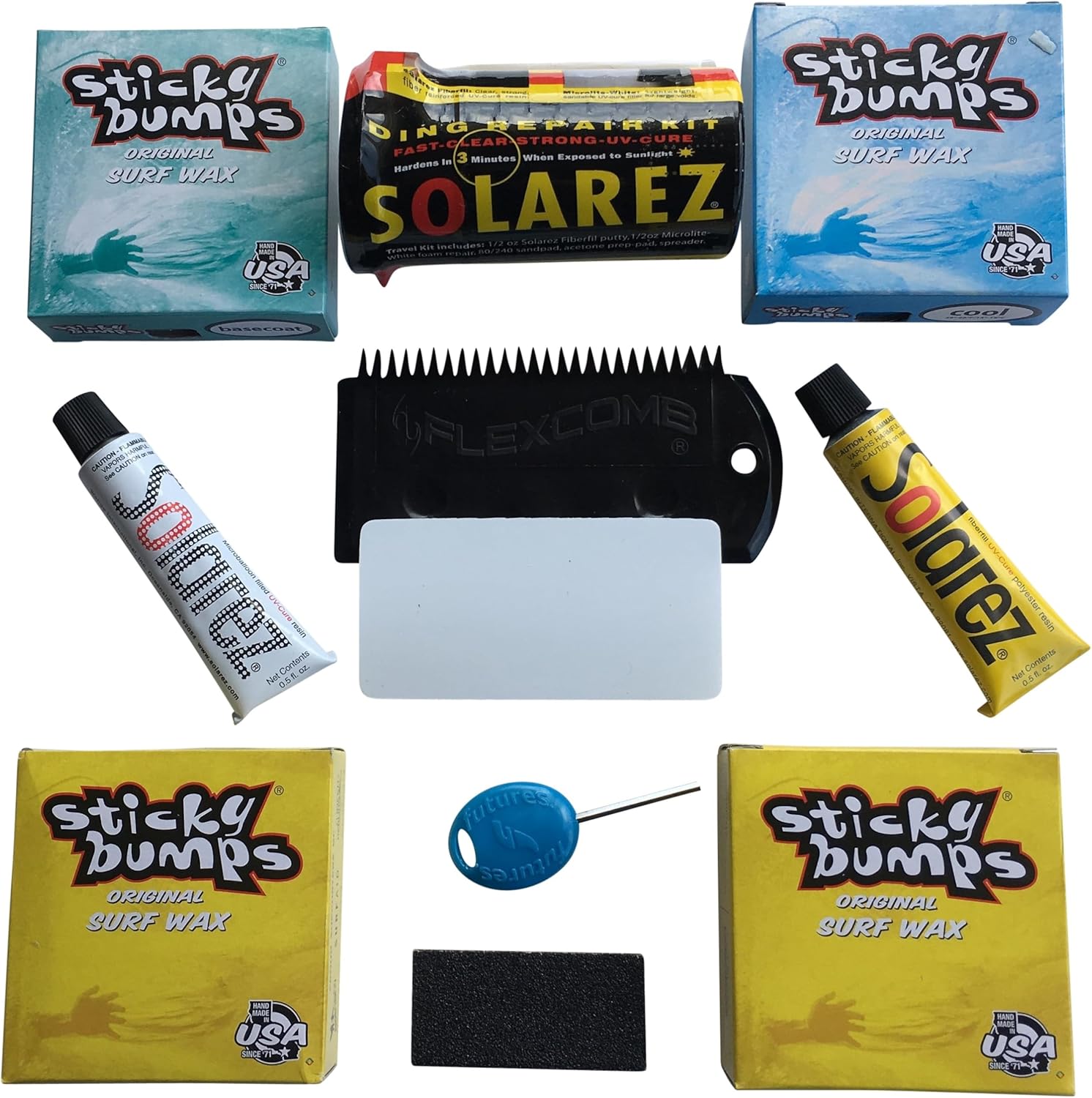 Sticky Bumps Wax and Solarez UV Cure Resin Ding Repair Kit is ideal for surfboard maintenance.