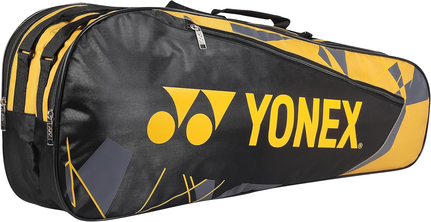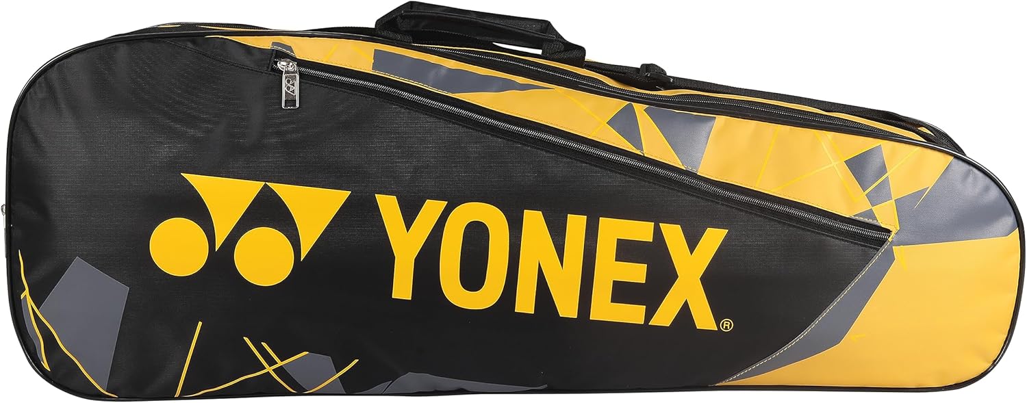 Model Number: SUNR 2215The YONEX Badminton Bag SUNR 2215 in Black and Yellow is a versatile and spacious bag designed for badminton players. This bag is made from durable polyester and nylon materials, ensuring long-lasting protection for your badminton equipment. It features ample space to store multiple rackets.