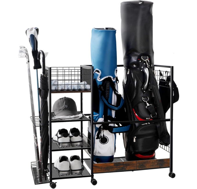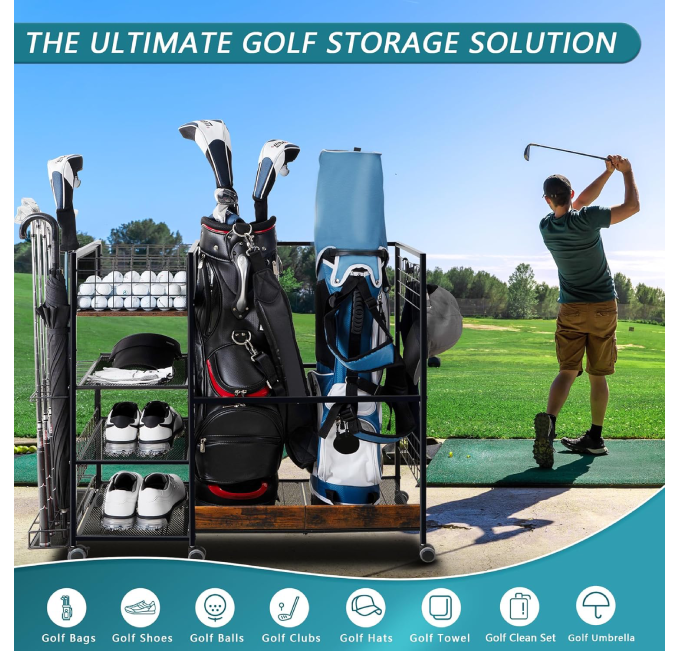 - Complete Storage Solution: This golf bag organizer offers a comprehensive storage solution for your gear. It holds up to two standard golf bags, features a mesh rack for golf balls and accessories, 3 shelves for shoes and hats, 2 hooks for gloves or towels, and a side display for clubs, flags, and umbrellas.
