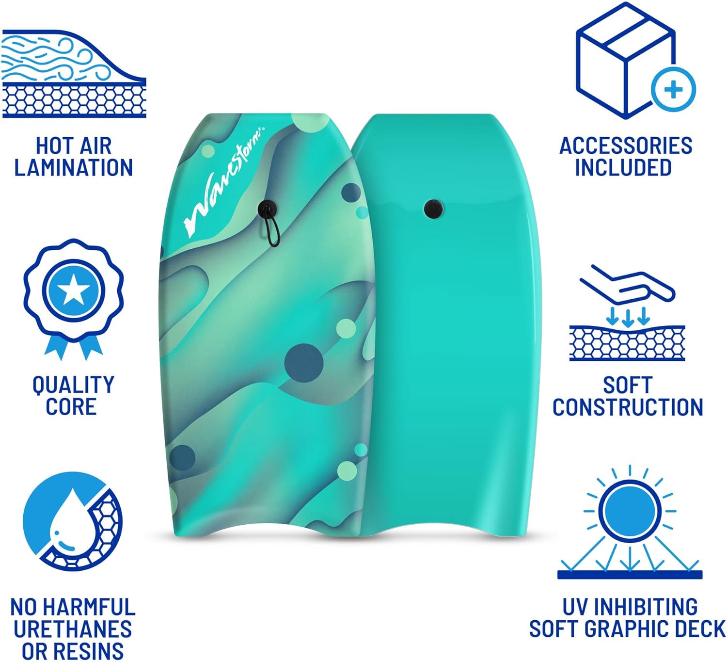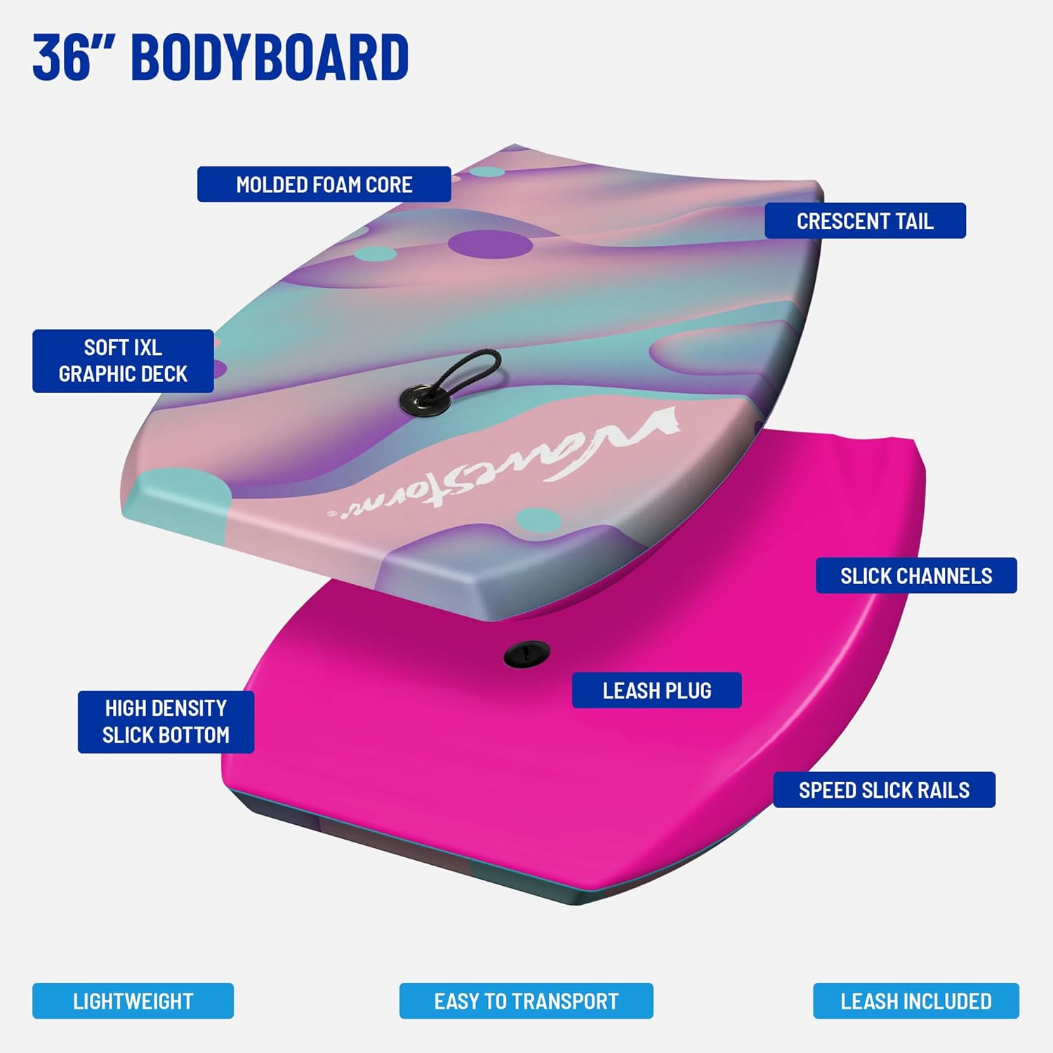 The Wavestorm 36in Bodyboard 2-Pack features a graphic top deck and slick bottom for smooth rides.